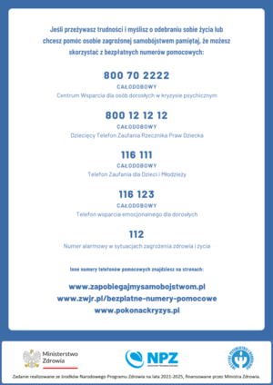 Przypominamy, że na terenie całego kraju działają instytucje, których przedstawiciele są gotowi nieść pomoc w sytuacjach kryzysowych. Prośba o pomoc nie jest powodem do wstydu. Wystarczy wykonać jeden telefon lub przyjść na rozmowę, aby otrzymać fachowe wsparcie i pomoc.